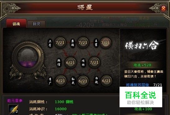 【早期攻略】 游戏的早期,除了冲级以外,成长线的【医道】、【将星】、【奇术】也是首当其冲需要提升的。 这就涉及到上面说的刷任务了,将在任务中所得的【神识】、【铜钱】,全部砸到这三个系统的属性加成中。早期的战力就是这样一点点叠上去的,还真别说,效果那叫一个响当当! 【将星】 镇魂是早期抢占高战力的第一个里程碑,只要一有【神识】就点它!在此给点小建议:乾元雪参有的话就用,没有的话也不需要刻意买了。一个就加一点成功率,一次只能用两个,鸡肋产品。 不过镇魂到了6,7以后,【神识】不足将是很大的问题。有充足元宝的大大们,可以去商城买神识丹,直接强补神识冲上去!比较经济的亲们就只能等做任务,慢慢积累啦~封灵的话,纯粹的元宝消费系统,砸上去会加不少战力。不过就看个人能力啦。 【医道】 青囊就是之前所说的那个需要野外打怪掉道具的系统啦。纯人力活儿~不过集满打怪道具以后,还得有青囊脉针来进行最后的冲刺。对于初级玩家来说,不得不说这是一个好的晋升战力途径。 五禽戏的进阶对于普通玩家来说,需要一点一点累计。每天的副本可以掉落一些相关的道具,但是很有限。
