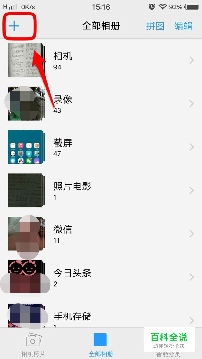 打开手机相册,点击左上方的“+”号,然后就会出现手机相册隐藏的功能。