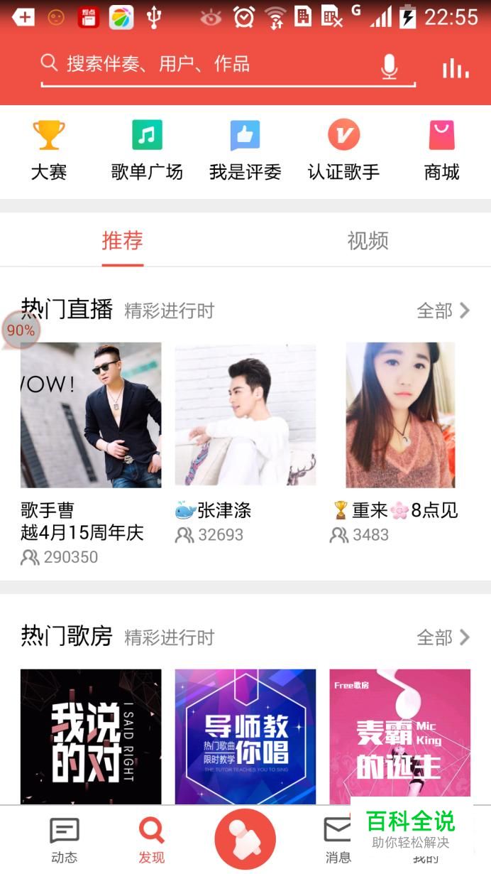 在手机桌面打开全民K歌,点击主界面下方的“发现”,在出现的页面往下拉,就会看到“热门歌房”。