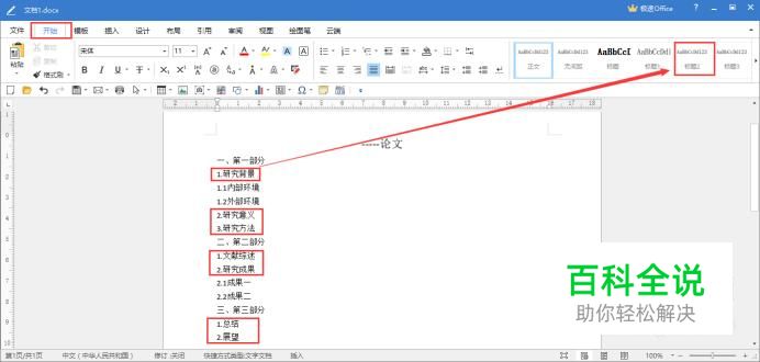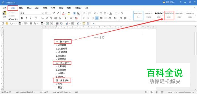选中文中一级标题,在“开始”选项卡中点击“标题1”,依次将所有的一级标题进行设置。