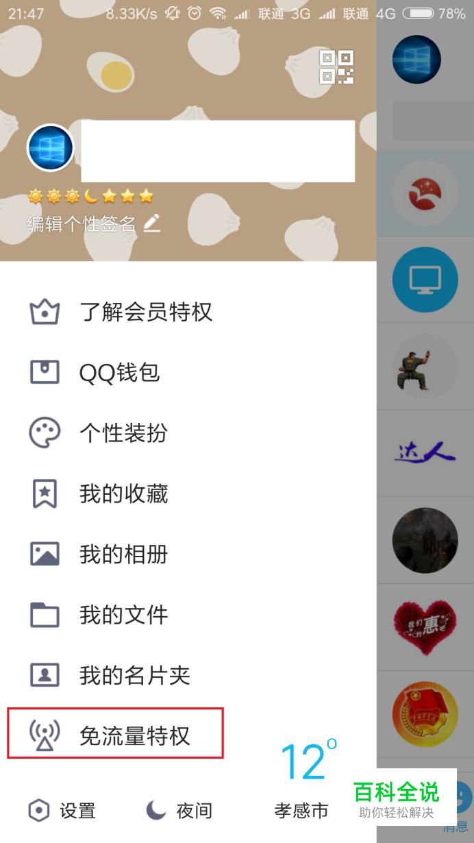 首先,打开手机QQ软件主页面,点击页面顶部个人头像选项,在展开的菜单中,选择“免流量特权”菜单按钮。
