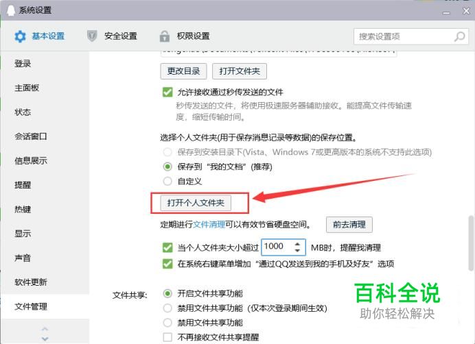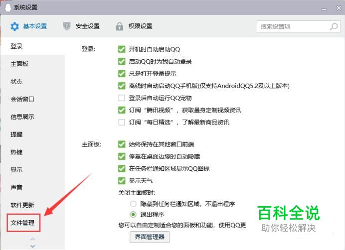首先我们在电脑上打开QQ的系统设置面板,点击【文件管理】,如下图所示。