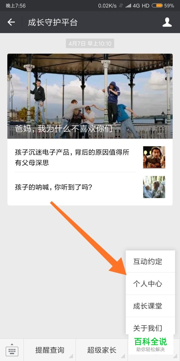 进入微信公众号后,然后点击“成长守护平台”公众号菜单栏“我”,再进入到“个人中心”。