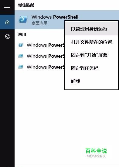 在顶部的搜索结果“Windows Powershell”上点击右键,选择“以管理员身份运行”。