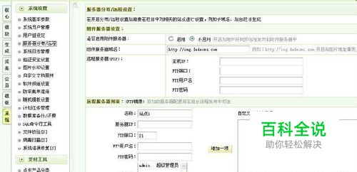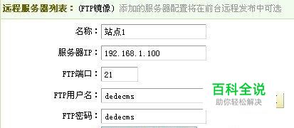 配置远程服务器列表 (1) 配置ftp信息 根据自己有的ftp服务器来进行配置 我的ftp地址是:192.168.1.100 用户名和密码都是:dedecms端口是21 不要忘记选择管理员 (2) 点击“增加一项”