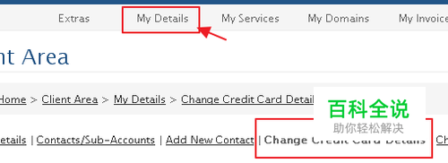 在WebHostingpad客户中心菜单栏中选择“My Dtails”,进入后选择“Change Credit CardDetails”修改信用卡信息选项,如下图所示: