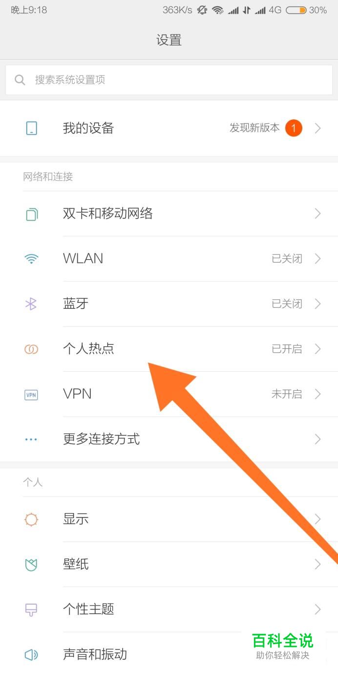 然后找到“个人热点”设置选项,点击进入。