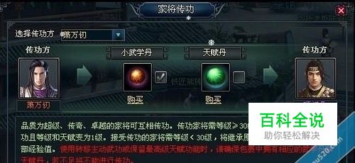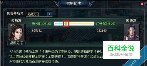 【家将升级】 自动升级 家将在打野怪时会获得经验,当经验达到升级标准时,将自动升级。 人物传功 如果玩家招到了品质较好的家将,可以将人物主角的经验传给家将,更快速的提升家将的等级,从而更有效的提高整体出战能力。 在家将面板中点击“传功”按钮,出现传功界面: 当家将等级≤人物等级时,可以将人物当前积累的经验分配给家将。通过拉动如上图红色框中的滚动条,您可以精确地将人物经验分配给家将。 家将传功 玩家还可免费将某个家将的经验和被动武功无损地转移给新家将。 更多信息请查阅参考资料!