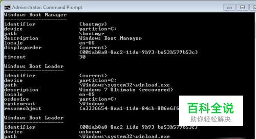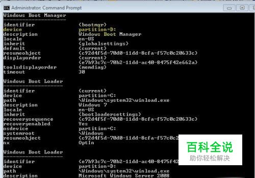 下图是启动配置数据编辑器的当前输出情况: 要更改输入条目,这样它们就不会以recovered的形式显示出来,输入:Bcdedit /set description “Windows 7 Ultimate” Bcdedit /set description “Windows Server reg; 2008 Enterprise” 注意:将替换成列表中所列的任意ID。