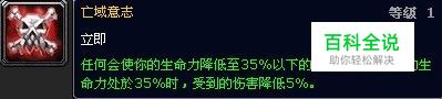 亡域意志被动 任何会使你的生命力降低至35%以下的攻击,或者当你的生命力处于35%时,受到的伤害降低5%。,少于你5%生命力的伤害亦可触发此效果。 述评:深鲜血目前重要的深层生存能力天赋,由于英文译名不同又称为“大墓地的意志”简称“大墓地”。3.3.3版本最振奋人心的改动之一: 15秒触发CD取消,对于大多数装备免伤没有达到较高水准的中端鲜血坦克而言,这是最大的福音。对于部分装备水准超一流的鲜血坦克而言,这个改动也将更多地确保坦克的生存。尽管暴雪蓝帖在改动放出后进行了诸如“我们不会再设置超强伤害超高频率的BOSS以突出大墓地的改动对于死骑坦克的意义”之类的解释,以求为死骑玩家们对于该改动的大声欢呼和狂喜而降温,同时对其他坦克职业众进行适当安抚,但这个改动已经使此 天赋变为最令死骑坦克欣慰的3.3.3坦克天赋,这是不争的事实。