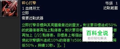 碎心打击 1 血魄 5 码 瞬发 需要:近战武器 立即打击目标与其周围最靠近的盟友,对主要目标造成50%的武器伤害再加上点伤害,对次要目标造成[25]%的武器伤害再加上[/2]点伤害。 目标身上每个由你引起的疾病效果可使此攻击额外造成10%的伤害。 述评:鲜血系天赋41点的独有的核心打击类技能,经过若干版本的演变而逐步成为深鲜血最有价值的核心输出技能并据此衍生了传统碎心流和传染碎心流,因为其作为三系41点核心技能(碎心/灭寂/天谴打击)是三者中唯一消耗单符文的技能特点,使得循环中该技能的大量运用和目前版本的技能Buff奠定了目前单体输出下深鲜血碎心流的领头羊地位。无论是什么类型的死骑走到深鲜血41点这里必出。配合凋文后可同时降低目标的50%移动速度,持续10秒,PVP意义突出。