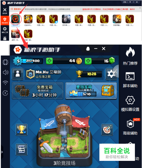 打开工具,点击启动侧边栏“我的游戏”中的“皇室战争”游戏图标,进入游戏;