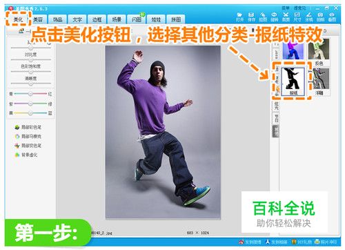 在“美图秀秀”软件下,打开一张真实的照片,当然选择照片时最好是有比较给力的POSE。然后在“美化”菜单下,选择“其他”分类下的“报纸”特效。