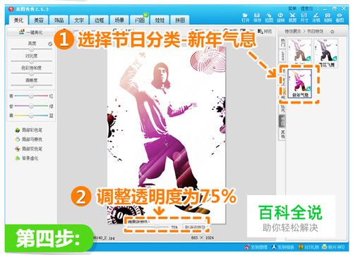 要提高海报的质感,一种特效可能无法满足需要。可以利用多种特效进行叠加,会有意想不到的效果哦!这里再添加一个“节日”分类下的“新年气息”,并将其特效透明度调至75%。
