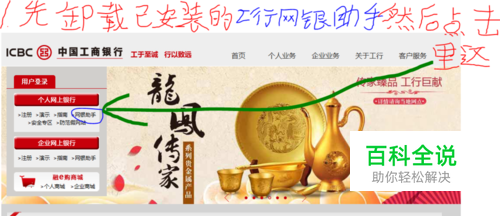 先点击开始菜单,找到”工行网银助手“,右键单击,点击"以管理员身份运行",退出重新打开试一下能不能识别了;如果不行,接下来先从"控制面板-程序“中删除 "工行网银助手"然后用"IE浏览器"打开"工行网上银行"如图: