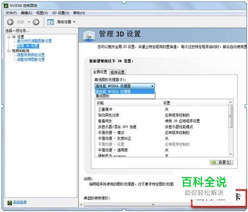 2、然后弹出NVIDIA的设置菜单,选择管理3D设置,就会看到全局使用集显或者独显的选项,选择独立显卡之后,系统执行任务的时候就会使用你选择的显卡: