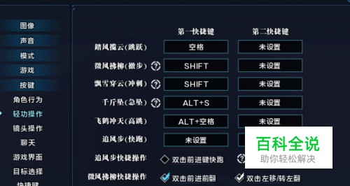 1 ESC设置里面 2 轻功设置选项下面有双击A,S,D可以翻滚选项,勾选下就好了(如图4个勾) 3 应用,确定