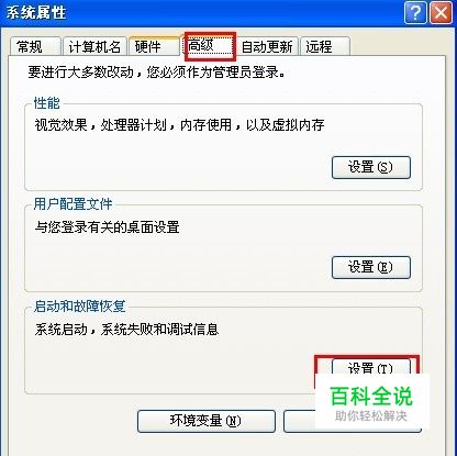 在打开的系统属性对话框中,切换到“高级”标签,然后点击“启用和故障恢复”下的“设置”。