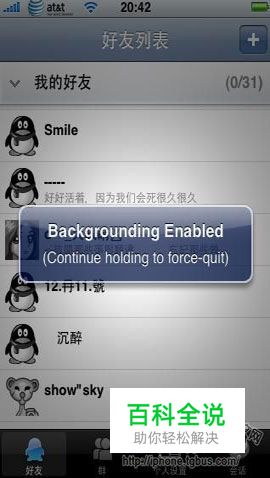 需要注意是:按一下home不会进入后台回直接退出QQ程序,按几秒home以后出现图2的显示。这就表示进入后台了。如果不想使用后台了回到桌面再次点开QQ 长按home键盘出现backgrounding disabled的字样就退出后台了。
