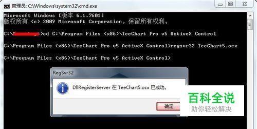 安装完后需要对控件进行简单的注册,打开cmd,通过cd指令并粘贴原来复制好的路径,转到软件安装好的目录; 接着输入:regsvr32 TeeChart5.ocx,然后弹出对话框提示注册成功