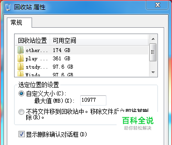 第二种方法的第一步是鼠标右键单击回收站,然后选择“属性”。然后会弹出如图所示的对话框。