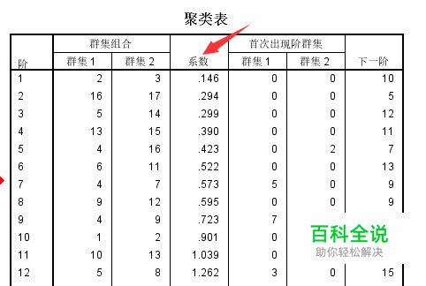 系统聚类的类别数可用聚合系数来确定。系统聚类的SPSS操作请查看以下经验条目,此处不再赘述。SPSS系统聚类的输出结果中,“聚类表”的“系数”列即为聚合系数,如下图箭头所示。