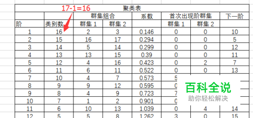 将聚类表拷贝到excel中,利用参与聚类的样品总数,减去聚类表中的第一列,该列将要划分的类别数。本例中有17个样本参与聚类,故“类别数”列等于用17分别减去第一列的数值。具体如下图所示。