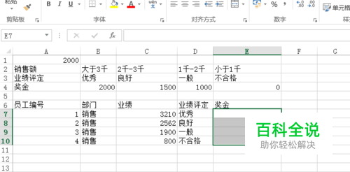 现在有一个表,我们需要根据员成绩评定的结果来算出他们的奖金,如图所示;
