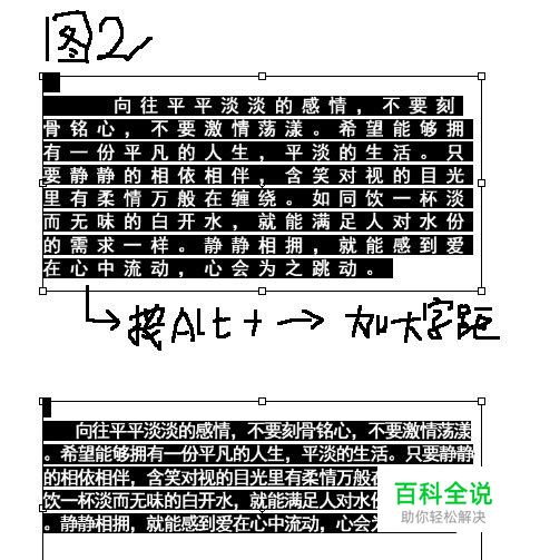 3、调节文字的间距,选中文字的状态下按Alt + →键是加大文字间距,反之按Alt+ ←键是缩小文字间距。如图2所示。