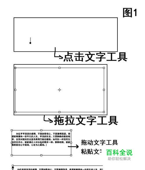 2、其实,在文字排版时根据情况灵活运用文字工具比较好,比如,只输入几个字的话就用文字工具点击输入地方就行,但是如果是段落的话,无论是用文字工具点击打字还是文字工具点击后右键粘贴文字,都很麻烦,并不是说粘贴麻烦,而是后期编辑会很麻烦,因为一粘贴,文字成一行,然后回车,再调整行距,字距(之前我就是那样),真的很繁琐。 用文字工具拖拉出一个带调整点的框,在框内无论粘贴或复制文字,文字都会在框里边,且自动换行,如图1所示。
