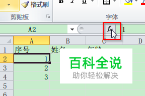 选中序号1单元格,然后单击插入函数符号,见图。