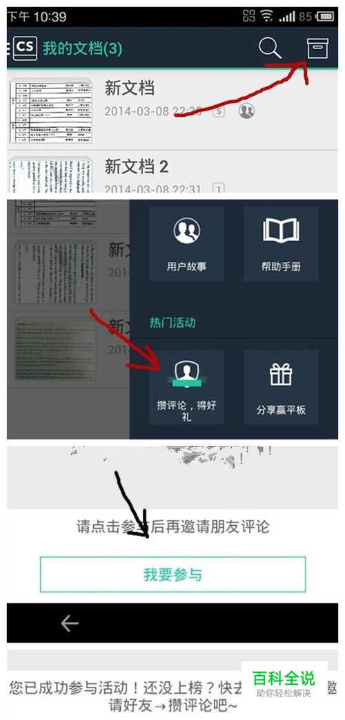 滑出右侧栏,进入“攒评论,得好礼”活动---点击我要参与---成功参与成功。如下图。