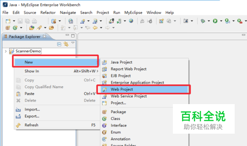 在MyEclipse窗口中,找到“Package Explorer”在此区域中右键,选择“New”,进入下级选项,选择“Web Project”。