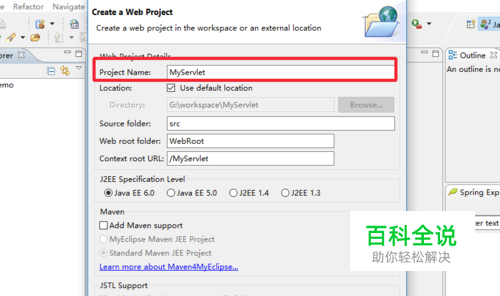 在“Project Name”后的文本框中填写项目名称“MyServlet”,点击“Finish”。