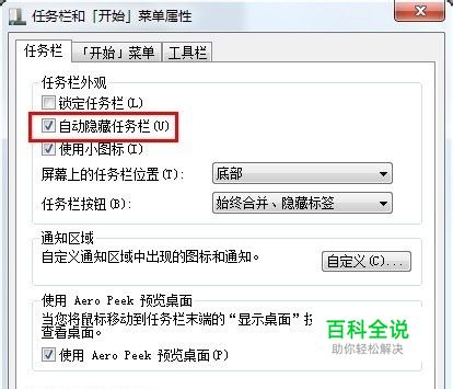 三、在打开的“任务栏和[开始]菜单属性”对话框中,“任务栏”选项卡中的“自动隐藏任务栏”一项是被勾选的。