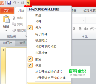 首先打开电脑上的PowerPoint 2010,点击扩展按钮,选择其他命令进入PowerPoint选项: