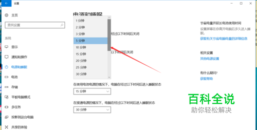 随后在睡眠的选项中,分别点击选择在使用电池电源情况下和在接通电源情况下进入睡眠状态的时间。