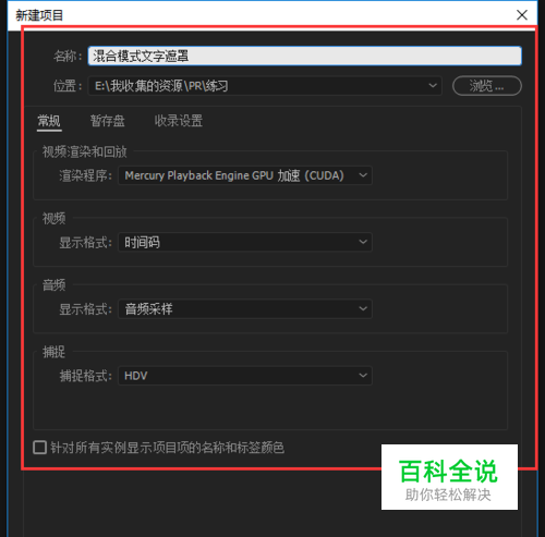 双击快捷图标打开Premiere视频剪辑软件,然后新建一个PR剪辑项目,在项目设置窗口中,项目名称可以写“混合模式文字遮罩”,选择一个电脑存储位置,其他设置可自行设置。