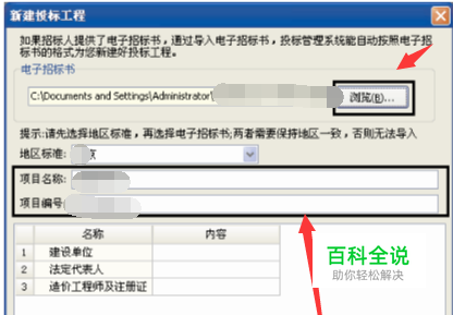 在新建投标工程界面,点击【浏览】,在桌面找到电子招标书文件,点击【打开】,软件会导入电子招标文件中的项目信息。如图所示。