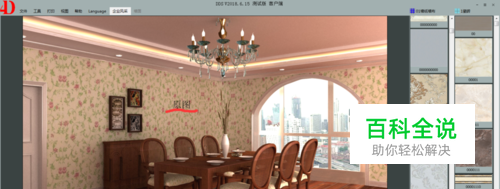 下面我们简单演示下四维星效果图设计软件的操作,你的产品拍照好的图片上传到软件即展示在软件的右方建材栏里面(这里申明,四维星软件基本包含了所有建材行业,包括全屋装修全屋定制都是可以的)这里我们只是拿墙纸来演示一下。你的产品图片上传到软件右方后,只需要拖动你的产品,例如这里的墙纸拖动到墙壁部位,即可直接完成效果展示