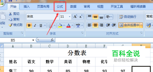 首先我们用鼠标选定求和后所得数字所在的位置,如下图中求和张三的总分,我们就在张三总分所对应的表格中点击一下,然后再点击页面上方工具栏中的“公式”按键。