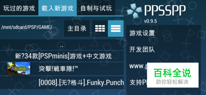 打开psp模拟器,界面如下,点击载入新游戏,找到你下载的游戏所存放的路径,我所存放的路径为/mnt/sdcard/PSP/GAME/