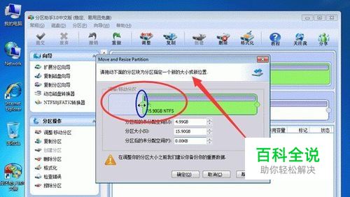 2、现在来缩小(即压缩)F盘到15.90GB,在F盘上右击在弹出的菜单中选择“调整/移动分区”选项,向右拖动左边的手柄以缩小F盘15.90GB。