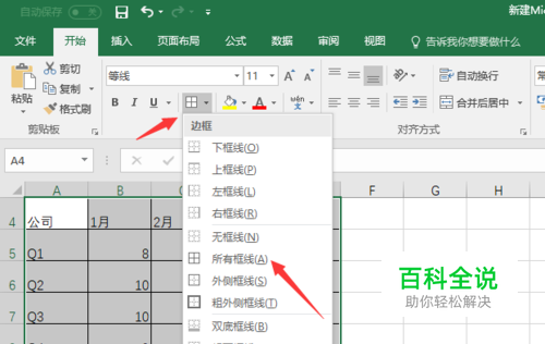 输入好数据之后,选中数据单元格,在【开始】选中所有框线。