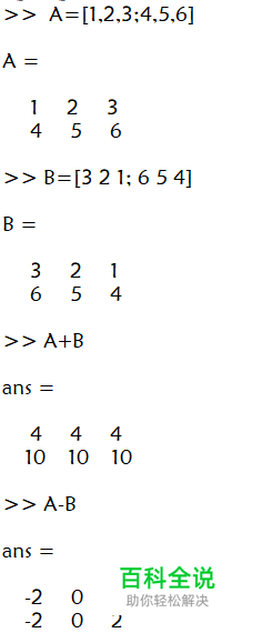 首先,我们有2*3的数组两个:A和B. 使用A+B求出对应元素之和,A-B求出对应元素之差。