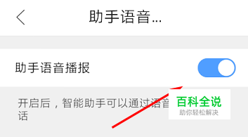 在扩展功能的界面,找到助手语音播报,开启后,智能助手可以通过语音播报与你对话,如图所示