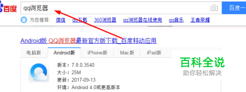 首先打开电脑桌面上的浏览器,搜索QQ浏览器,并下载与安装到手机里面,如图所示