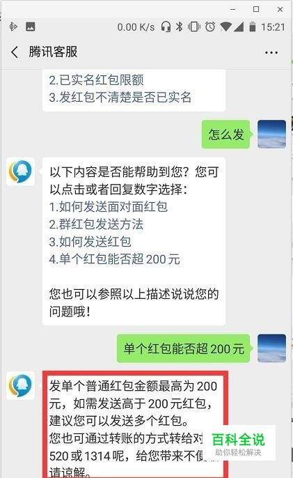 此时根据与客服进行交谈获取到目前单个红包最大只支持不大于200的红包,如果想要发送更大的红包需要转账或者多笔方式