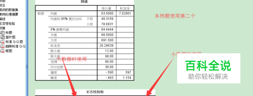 然后我们下啦结果到“正态性检验”你会发现,有2个检验结果,这个时候说明我们得依据情况而定,第一个k-s检验是大数据时候使用的检验,第二个s-w检验是小数据时候使用的。