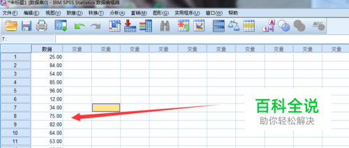 首先,我们打开spss,在变量视图里面输入“数据”,然后回到数据视图里面,将数据录入到数据这一列里面(这个是教程,具体情况具体录入)